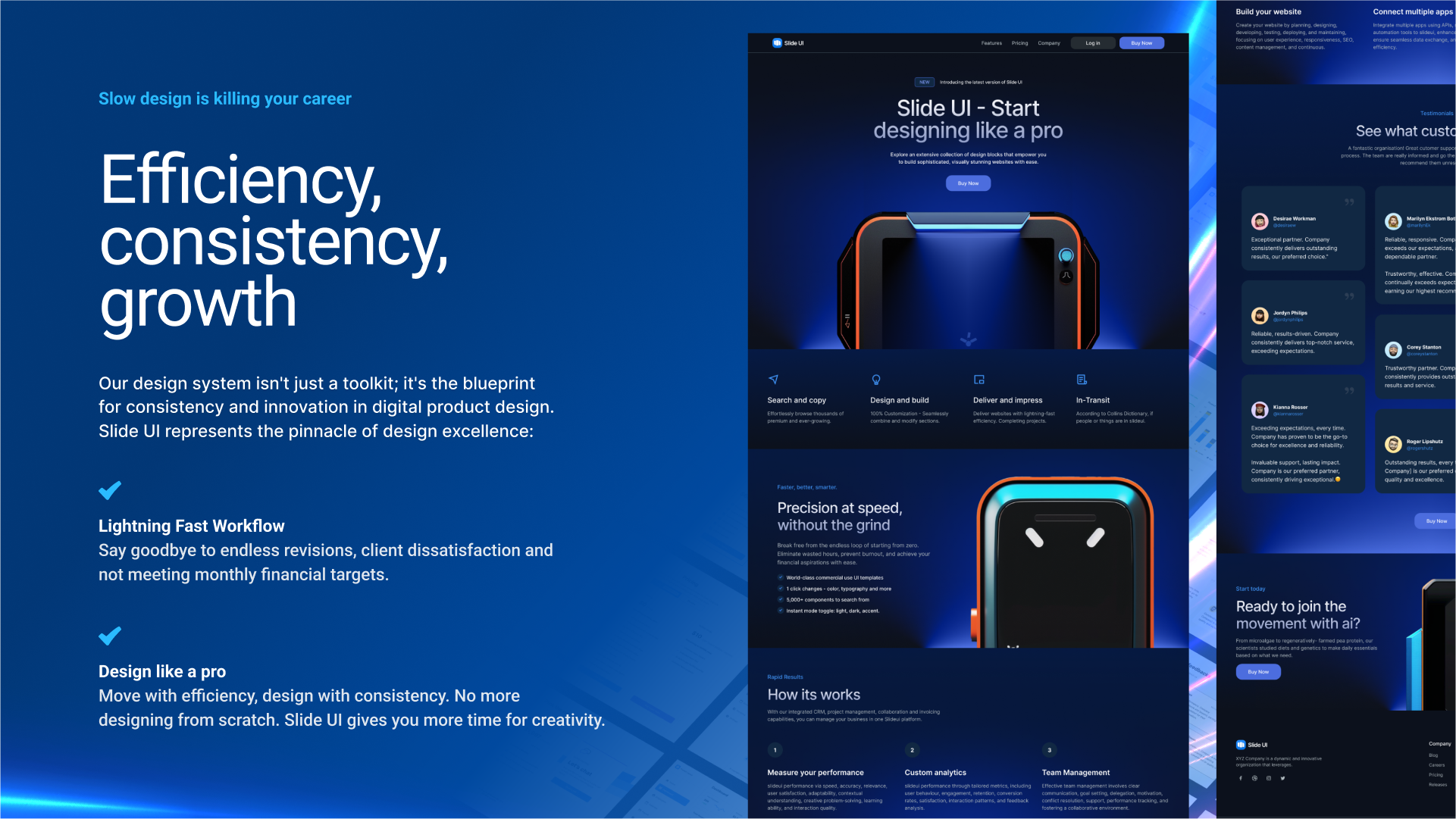 Save time and reduce stress with Slide UI. Our design system streamlines your workflow, allowing you to complete projects faster and take on more clients.