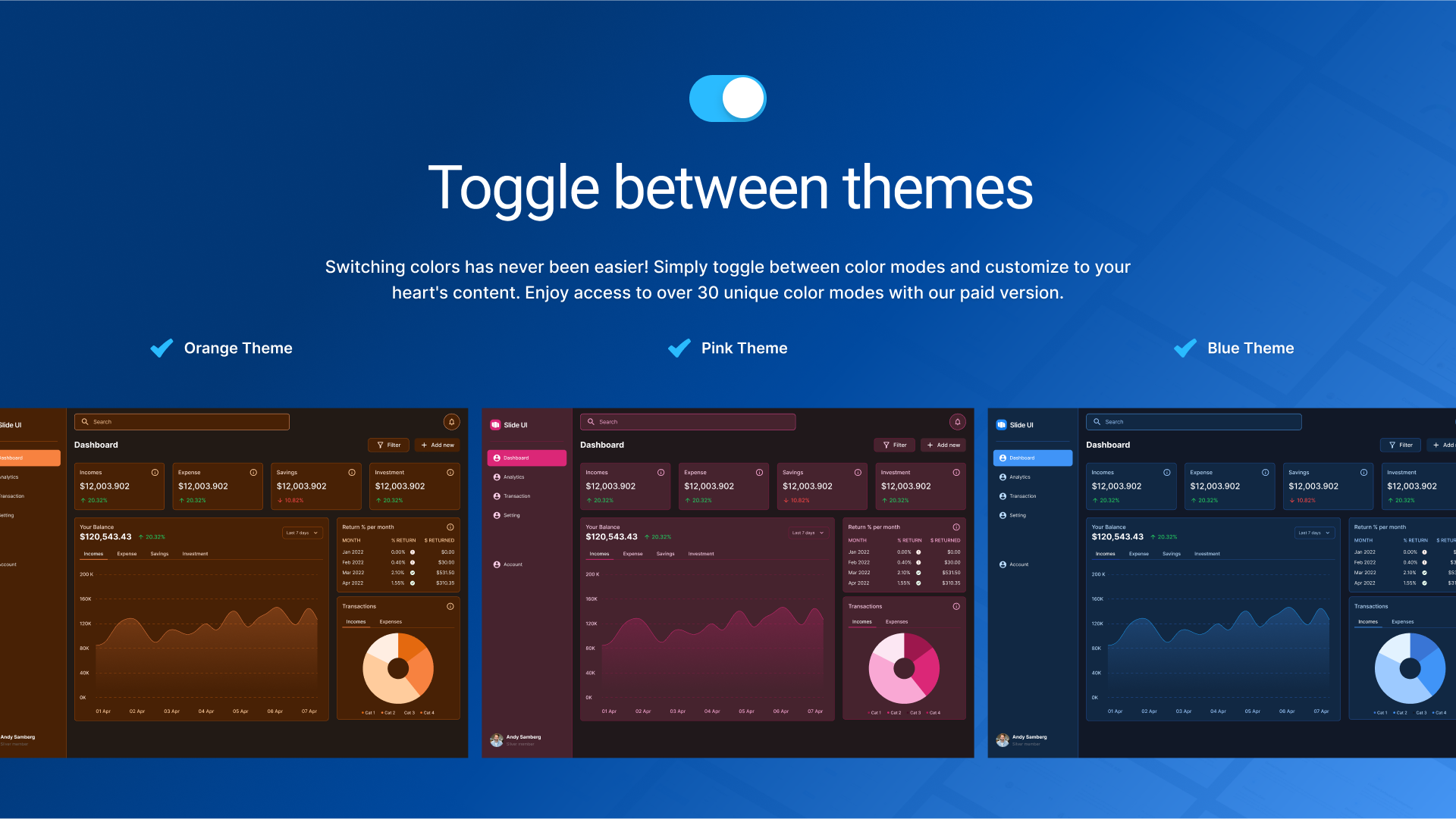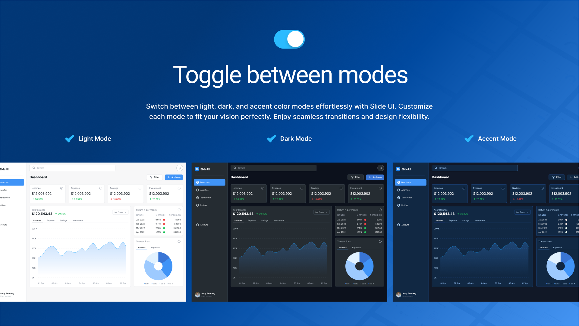 Toggle effortlessly between light, dark, and accent modes. This flexibility allows you to adapt your designs to different contexts and user preferences with ease.