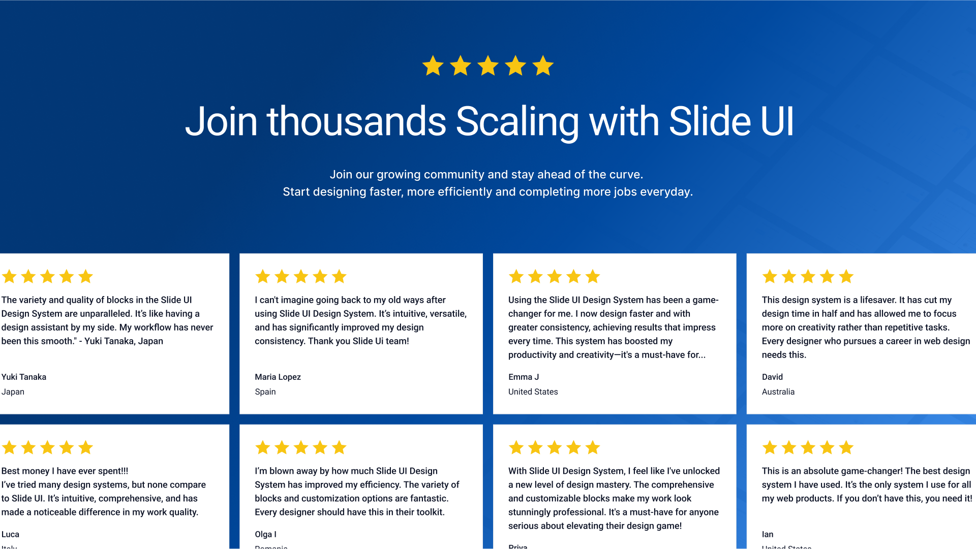 "Implementing Slide UI has not only sped up my design process but also elevated the quality of my work. It's an indispensable tool for modern designers who value time and excellence."